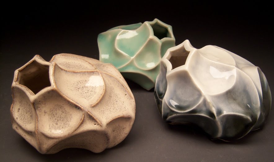 A few pieces in our Hallway Gallery showing the diversity of whats happening in ceramics. with Victoria, Nikki, and Harmony from the moldmaking class.